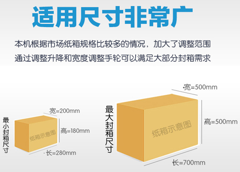 當(dāng)紙箱尺寸發(fā)生變化時(shí),需人工調(diào)整機(jī)器,以適應(yīng)包裝尺寸的變化。